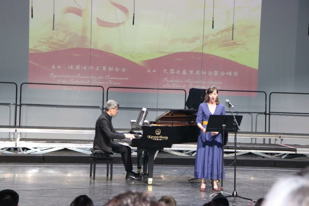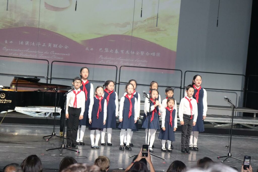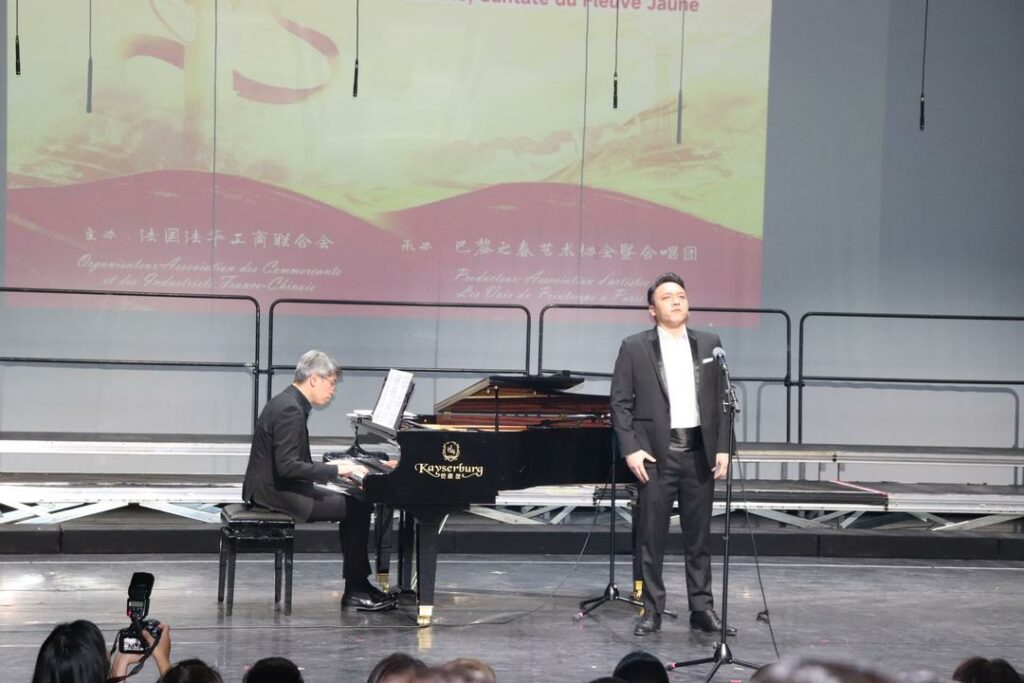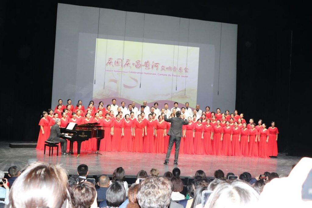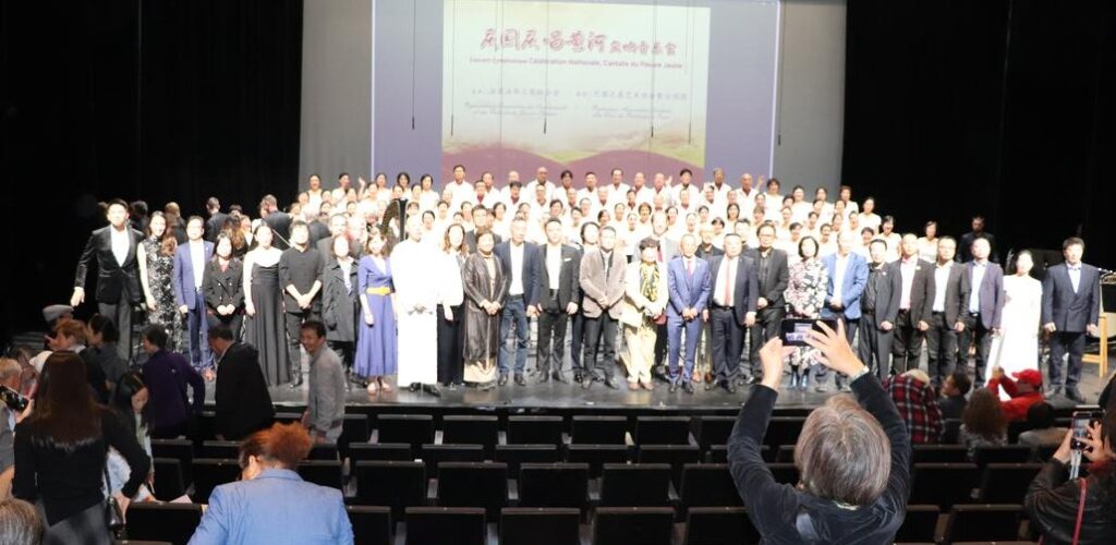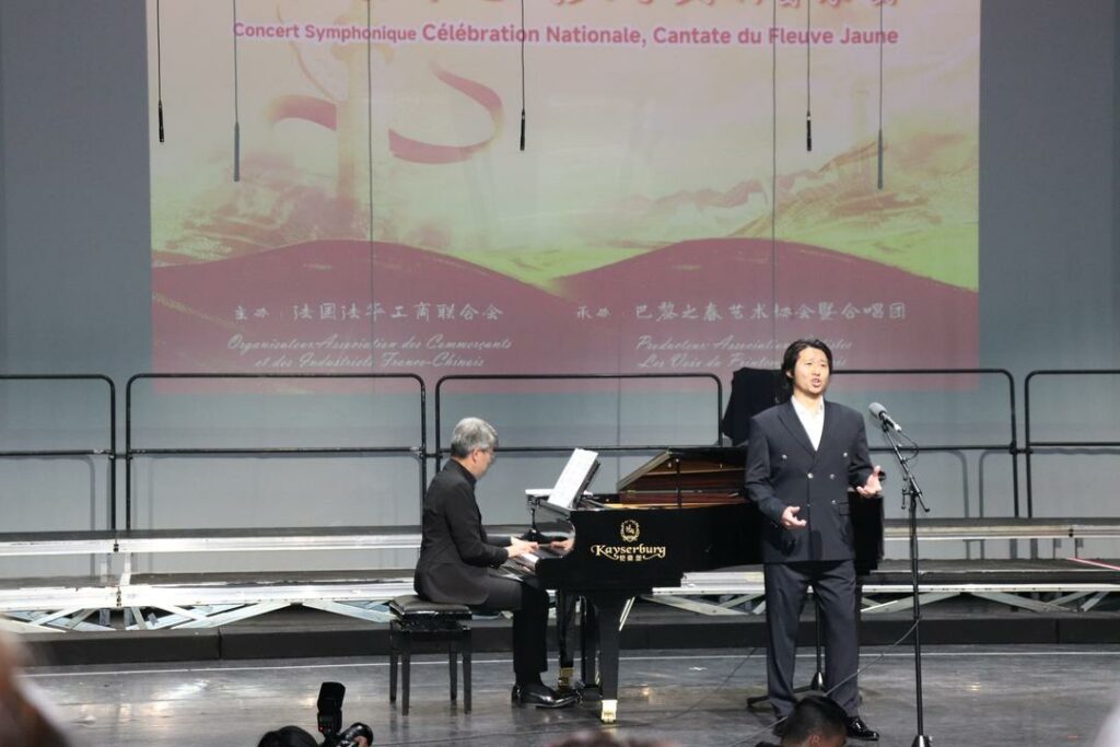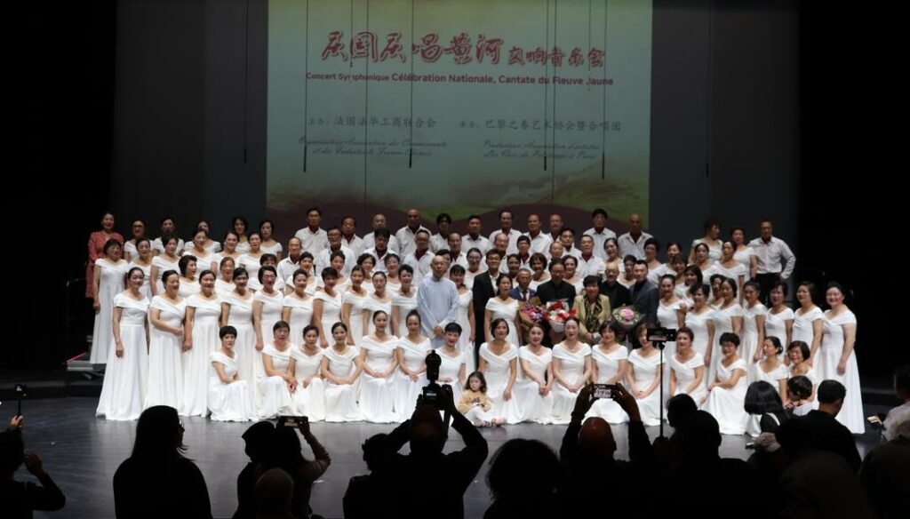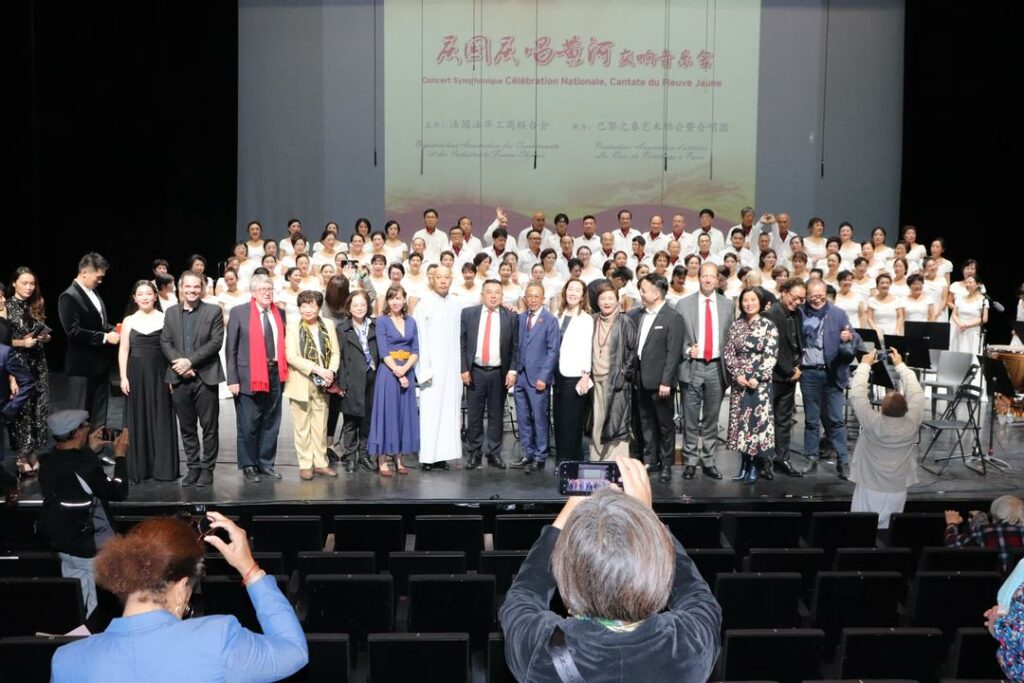 2025年10月1日,在中国驻法使馆的指导下,由法国法华工商联合会主办,巴黎之春艺术协会暨合唱团承办的“庆国庆·唱黄河”大型交响音乐会在巴黎十三区Le 13e Art剧院隆重上演。中国驻法国大使馆领侨处参赞万磊、法国华侨华人会主席蔡君柱、巴黎市议员奥雷利安·韦龙(Aurélien Véron)、法国复兴党全国委员叶飞燕(Christine YE)等20多位旅法侨团会长,以及上百位法国各界嘉宾与近900名中法观众共同欣赏了这一盛大演出。