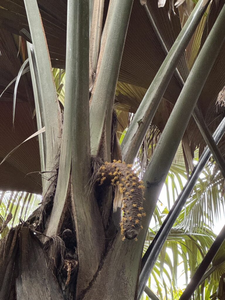 雌雄异株,长相差异巨大,雌株果实颇似女姓臀部,雄株花序形似男性生殖器,花粉的授粉过程需要一个小动物,林中壁虎🦎来完成,把雄枝上的花苞打开,然后风吹到雌体上。所以他们两个离的不会太近,也不会太远。若即若离可能是最好的相处模式吧。。。因此在当地文化中,海椰子寓意着爱情、繁衍和生命力。