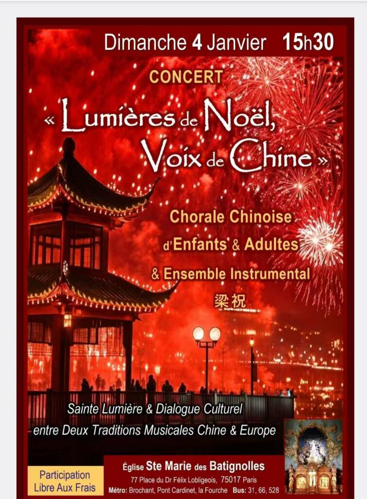 2026年1月4日,法国巴黎第17区的 Sainte-Marie des Batignolles 大教堂内座无虚席,600余个座位全部坐满,来宾中约80%为当地法国观众。由朱立阳女士率领的巴黎室内乐合唱团在此成功举办了题为《圣诞之光·中国之音》的新年音乐会。演出精彩纷呈,深受法国观众喜爱,现场掌声经久不息。整场音乐会共呈现14首作品,涵盖童声与成人合唱、独唱以及器乐演奏等多种形式。音乐编配匠心独运,中西器乐相互交融、相得益彰,营造出迷人而高雅的艺术氛围,令观众赞叹不已。