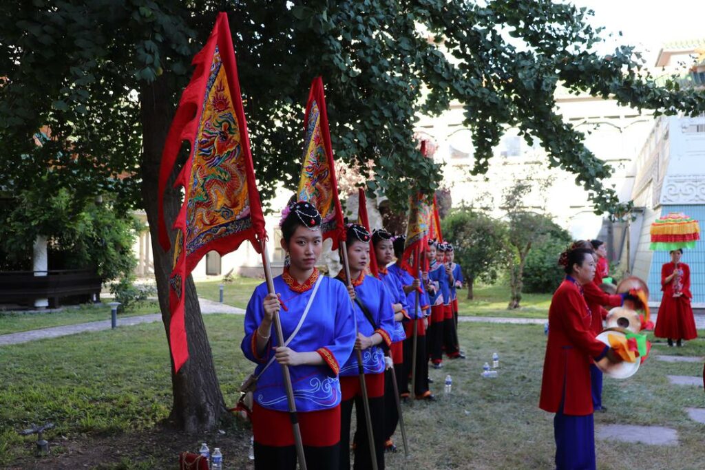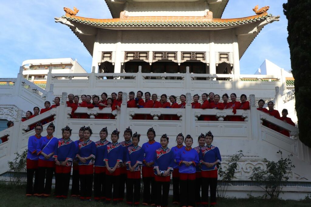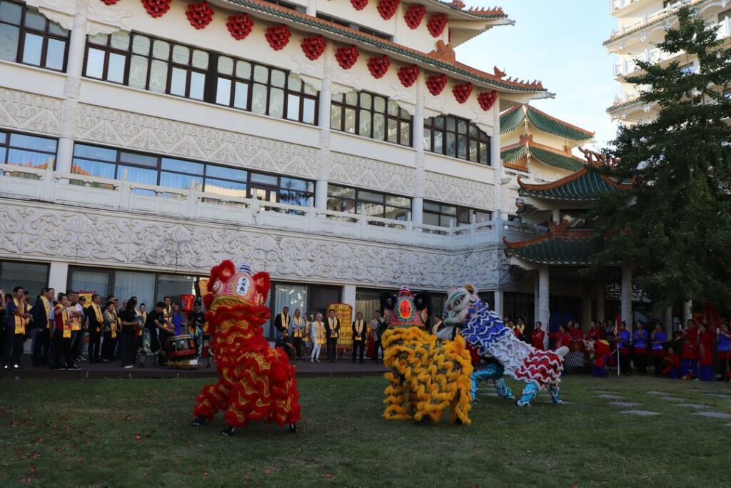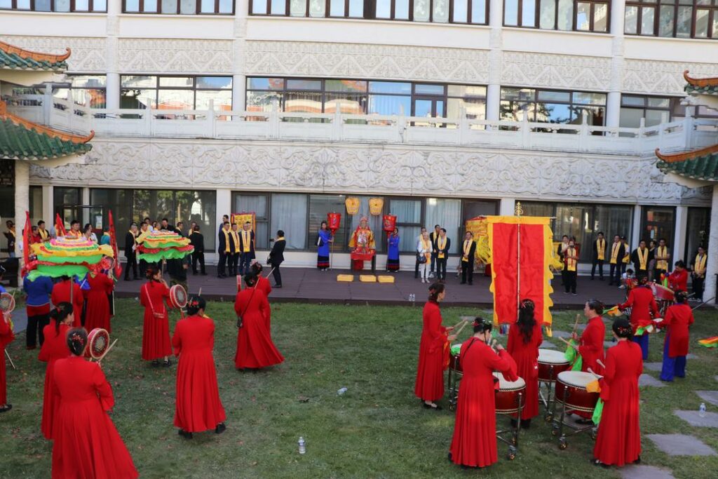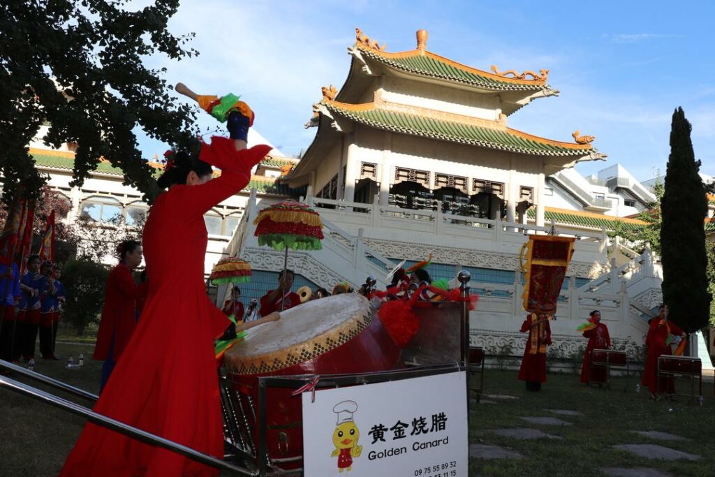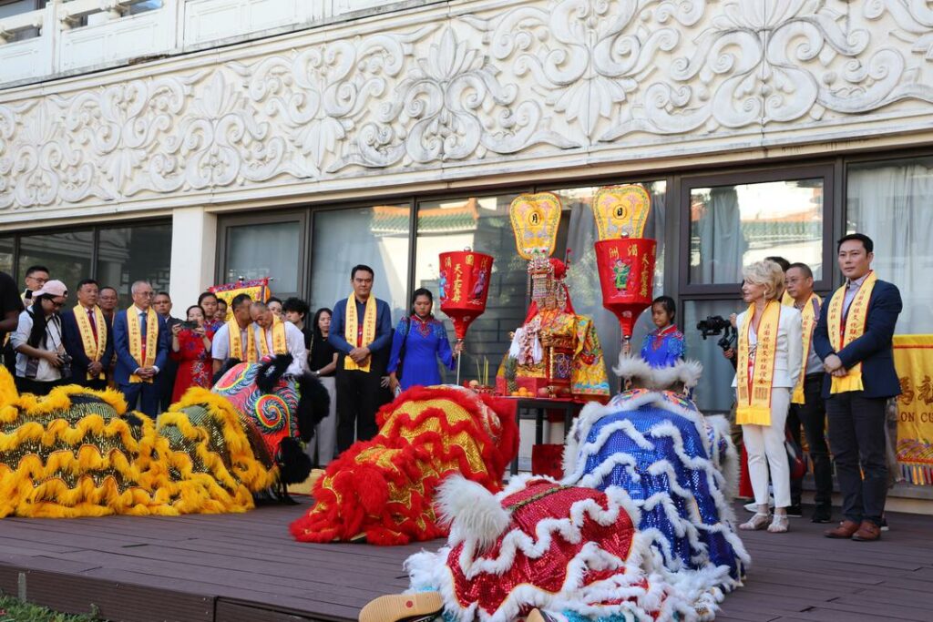 当晚6点,妈祖像前鼓乐齐鸣,法国莆田女子车鼓队、舞狮队轮番表演,锣鼓喧天、彩狮翻腾,掌声与喝彩声此起彼伏,气氛热烈。莆田特色的车鼓声中迎来了八方宾朋,大家佩戴绶带,虔诚参拜妈祖,感受浓浓的莆仙习俗韵味。广东醒狮表演则展现了中华文明的多元文化魅力。