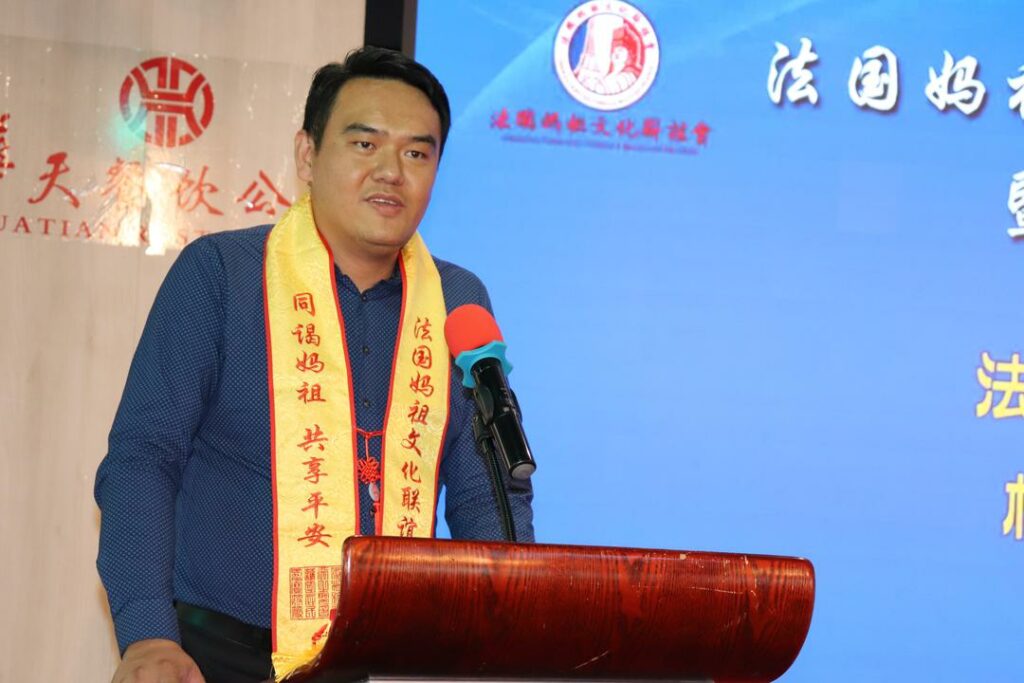 接着,法国妈祖文化联谊会会长林建斌致辞。他说:今天我们共同见证妈祖安座这一庄严而神圣的时刻,我谨代表联谊会向各位来宾表示热烈欢迎和衷心感谢。
