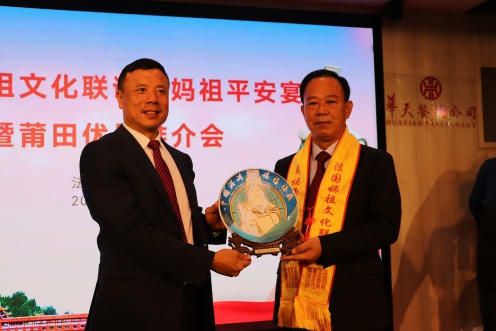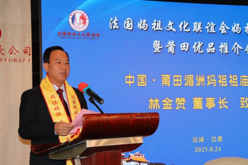福建省莆田市湄洲祖庙董事长林金赞致辞表示,非常荣幸随妈祖来到法国,与侨界同胞和各界朋友相聚。他代表祖庙董事会,向长期关心和支持妈祖文化的侨胞,以及为妈祖文化在法国扎根作出贡献的法国妈祖文化联谊会,表示衷心感谢和崇高敬意。