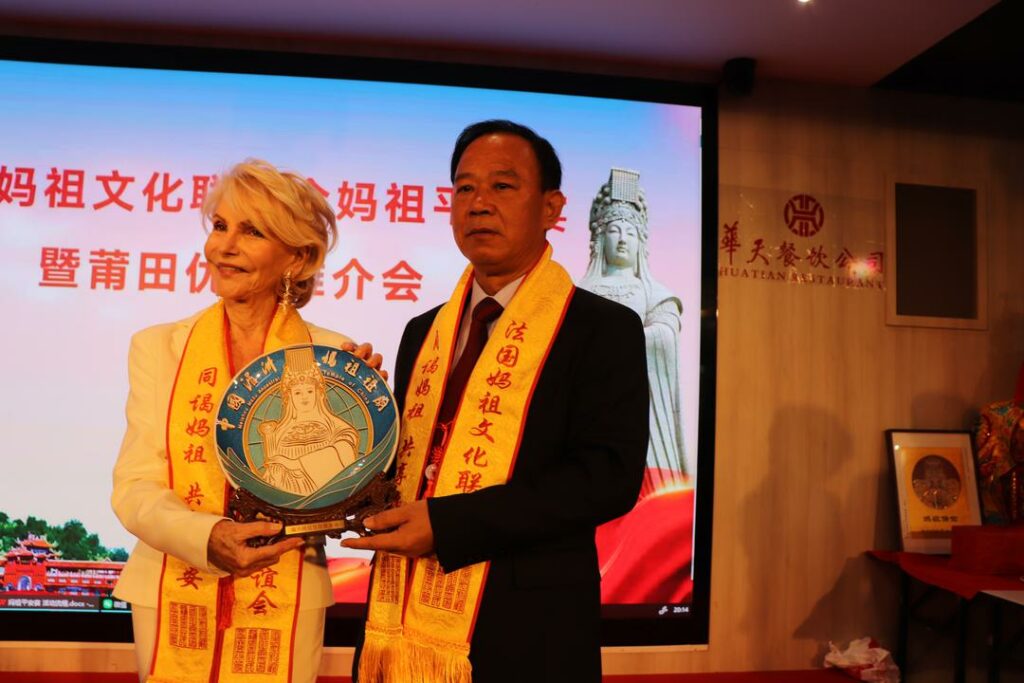 随后,湄洲祖庙董事长林金赞给法国妈祖文化联谊会会长林建斌、法国中国文化中心主任王萌、联合国教科文组织亲善大使埃德娃·塞尔、巴黎13区华人议员陈家辉、法国华侨华人会主席常务郑金标纷纷赠送了妈祖的礼物。
