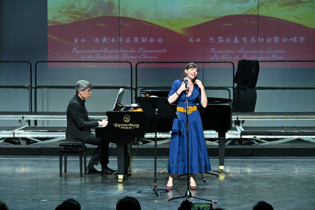 来自法国的著名女高音登台献唱《我爱你,中国》,声情并茂,柔美与热烈并存,将中法观众的心紧紧联结。紧接着,一曲充满友谊与激情的法文歌曲 《Salut la France》 响彻大厅,赢得了经久不息的掌声。