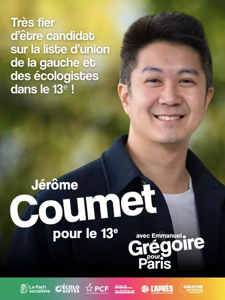 华裔 陈家辉 Daniel TRAN, 参加 M. Jérôme COUMET 领衔 Liste : « LE 13e EST À VOUS ! AVEC JÉRÔME COUMET ET EMMANUEL GRÉGOIRE L’UNION DE LA GAUCHE ET DES ÉCOLOGISTES » 的候选团名单, 排名第13位。