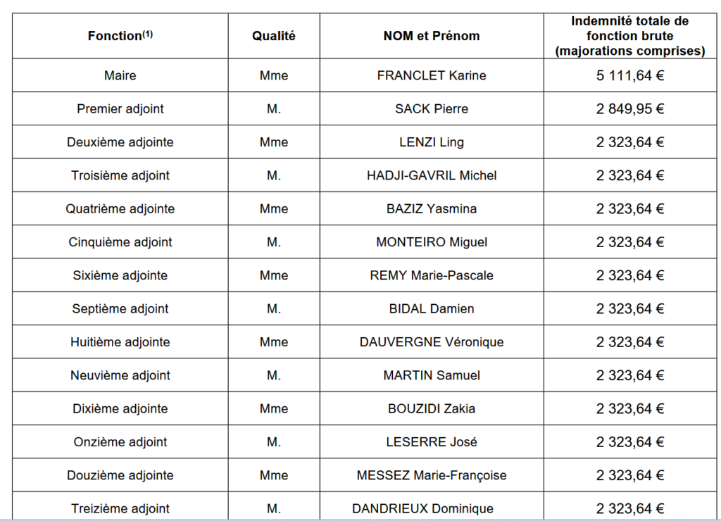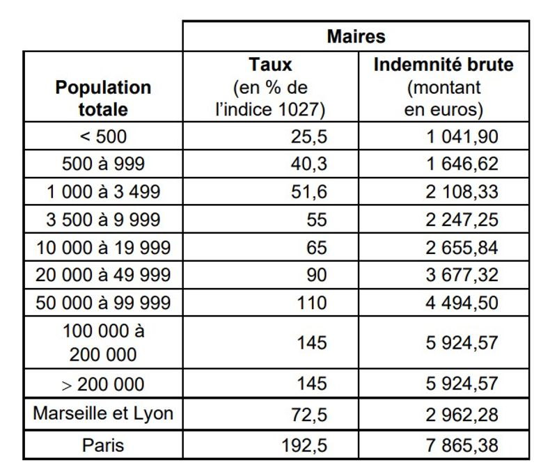 没有法律规定地方民选官员的薪酬以欧元为单位。但存在一项最高补偿金限额,该限额基于公务员薪酬等级表的终点指数计算得出,自2024年1月1日起设定为4110.52欧元,并根据两项标准确定:该地区人口数量及其职务(市长、副市长或市议员)。